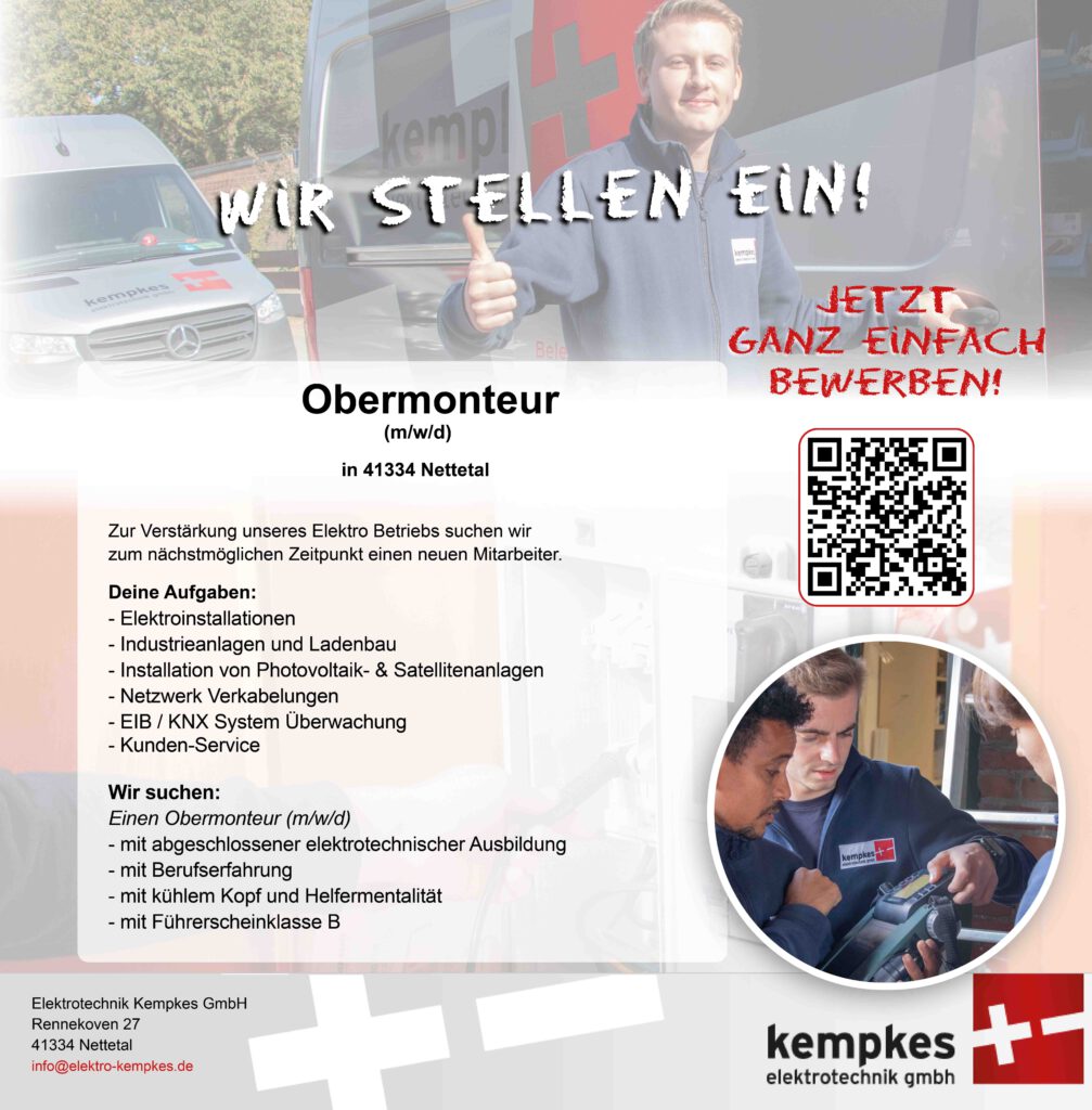 Bewirb dich jetzt schnell und ganz unkompliziert bei eines der führenden Elektrospezialisten in und um Nettetal​